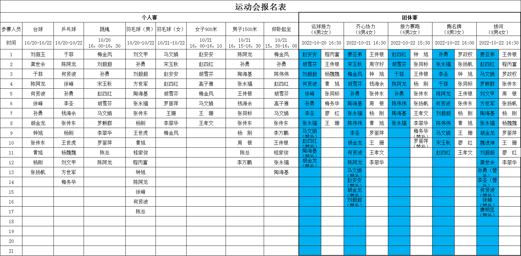 金秋送爽、丹桂飄香,在這秋高氣爽的美好時節(jié),我們滿懷喜悅的心情迎來了公司2022年度秋季職工運動會。本屆運動會分個人賽、團(tuán)體賽,自10月20日至22日共持續(xù)3個下午,比賽項目包括乒乓球、羽毛器(男子、女子單項)、臺球、跳繩、仰臥起坐、女子900米,男子1500米長跑8項個人賽,還有齊心協(xié)力、運球接力、女子接力賽、男子接力賽、撕名牌、拔河共6項團(tuán)體賽。在歷屆運動會的賽程、賽項上都增加了新的活動亮點,從參賽名單上不難看出,全體協(xié)普家人的熱情和參與度都異常高漲。